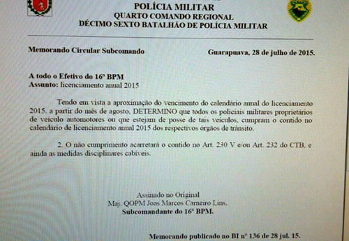 2. O não cumprimento acarretará o contido no Art. 230 V e/ou 232 do CTB e ainda as medidas disciplinares cabíveis", diz o texto, assinado pelo major Joas Marcos Carneiro Lins, Subcomandante do 16° Batalhão.