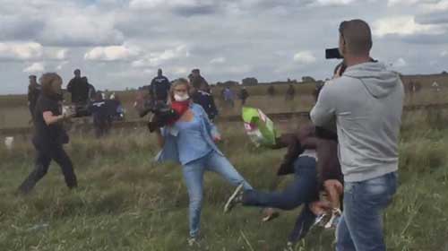 Uma cinegrafista húngara, que cobria um embate entre policiais e refugiados sírios no sul da Hungria, foi filmada derrubando um homem que tentava fugir do local com uma criança no colo. Ela também foi flagrada dando pontapés em outros dois refugiados.