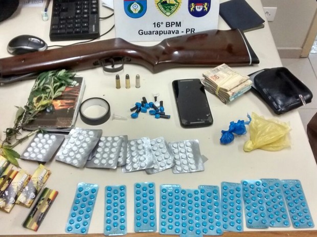 Um homem, de 30 anos, foi preso noite de sexta-feira (7), em Guarapuava, na região sul do Paraná, por suspeita de tráfico de drogas e posse ilegal de armas. De acordo com a Polícia Militar, foram apreendidos com o suspeito centenas de comprimidos para disfunção erétil e inibidores de sono, além de cocaína, maconha, haxixe, arma de pressão e munição.